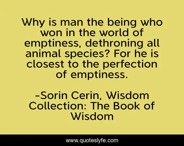 This page presents the quote "Why is man the being who won in the world of emptiness, dethroning all animal species? For he is closest to the perfection of emptiness.". Author of this quote is Sorin Cerin, Wisdom Collection: The Book of Wisdom. This quote is about dream, love, affection, man,.