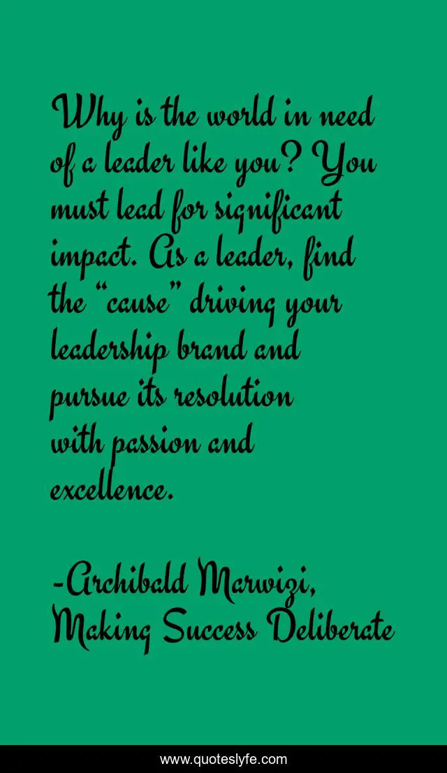 This page presents the quote "Why is the world in need of a leader like you? You must lead for significant impact. As a leader, find the “cause” driving your leadership brand and pursue its resolution with passion and excellence.". Author of this quote is Archibald Marwizi, Making Success Deliberate. This quote is about behaviour, attitude, balanced-life, benchmarking,.
