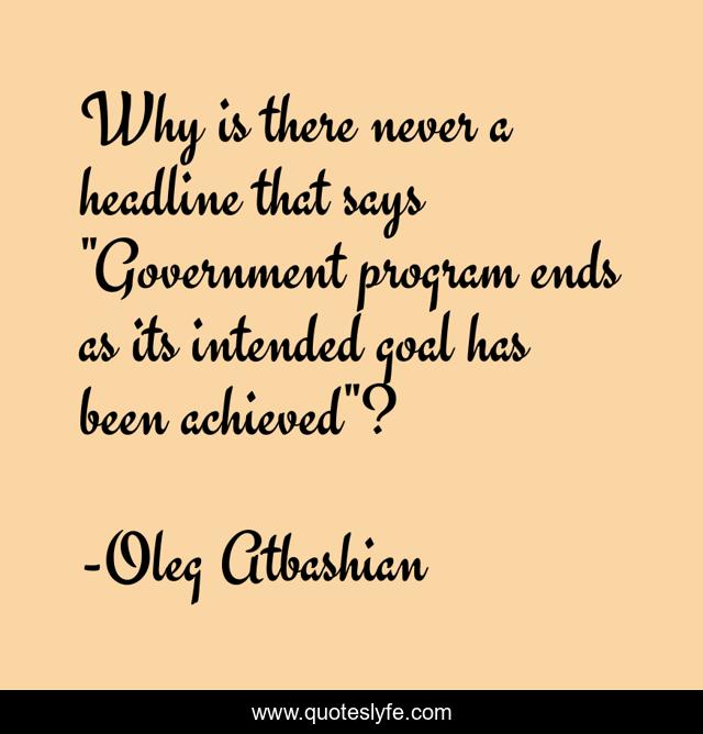 This page presents the quote "Why is there never a headline that says "Government program ends as its intended goal has been achieved"?". Author of this quote is Oleg Atbashian. This quote is about politics, conservatism, government,.
