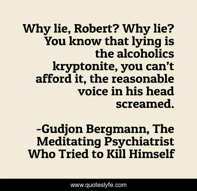This page presents the quote "Why lie, Robert? Why lie? You know that lying is the alcoholics kryptonite, you can’t afford it, the reasonable voice in his head screamed.". Author of this quote is Gudjon Bergmann, The Meditating Psychiatrist Who Tried to Kill Himself. This quote is about recovery, alcoholic,.
