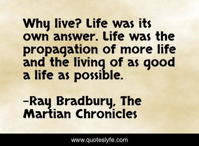 This page presents the quote "Why live? Life was its own answer. Life was the propagation of more life and the living of as good a life as possible.". Author of this quote is Ray Bradbury, The Martian Chronicles. .