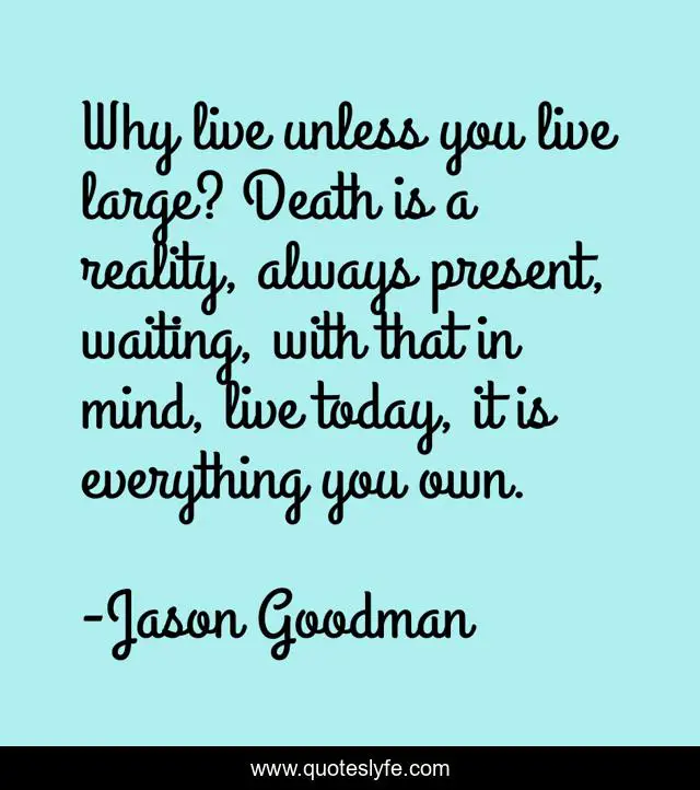 This page presents the quote "Why live unless you live large? Death is a reality, always present, waiting, with that in mind, live today, it is everything you own.". Author of this quote is Jason Goodman. This quote is about living, life, death, today, one,.