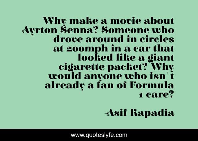 This page presents the quote "Why make a movie about Ayrton Senna? Someone who drove around in circles at 200mph in a car that looked like a giant cigarette packet? Why would anyone who isn't already a fan of Formula 1 care?". Author of this quote is Asif Kapadia. This quote is about care, like, why,.