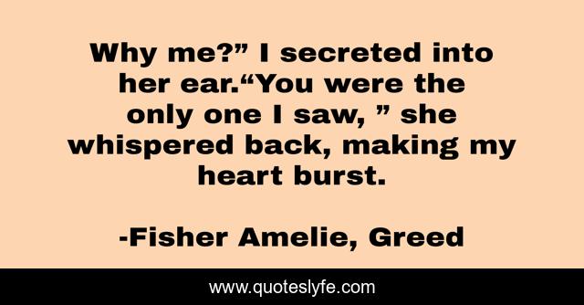 This page presents the quote "Why me?” I secreted into her ear.“You were the only one I saw, ” she whispered back, making my heart burst.". Author of this quote is Fisher Amelie, Greed. This quote is about cricket-hunt, eugie, greed, spencer-blackwell,.