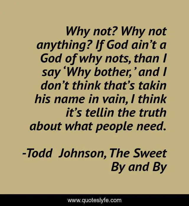 This page presents the quote "Why not? Why not anything? If God ain’t a God of why nots, than I say ‘Why bother, ’ and I don’t think that’s takin his name in vain, I think it’s tellin the truth about what people need.". Author of this quote is Todd Johnson, The Sweet By and By. This quote is about god, hope,.