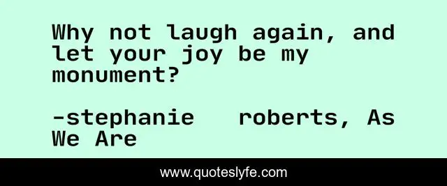 This page presents the quote "Why not laugh again, and let your joy be my monument?". Author of this quote is stephanie roberts, As We Are. This quote is about reconciliation, love, joy, grief, inspirational, enthusiasm, affection,.