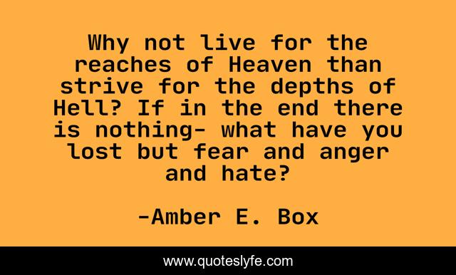This page presents the quote "Why not live for the reaches of Heaven than strive for the depths of Hell? If in the end there is nothing- what have you lost but fear and anger and hate?". Author of this quote is Amber E. Box. This quote is about love, heaven-and-hell, inspirational, enthusiasm, fear, religious, affection,.