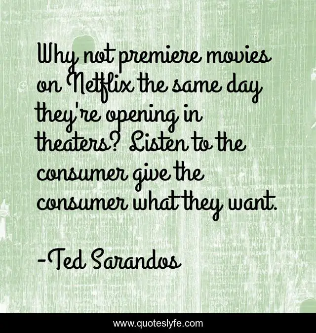 This page presents the quote "Why not premiere movies on Netflix the same day they're opening in theaters? Listen to the consumer give the consumer what they want.". Author of this quote is Ted Sarandos. This quote is about day, why,.