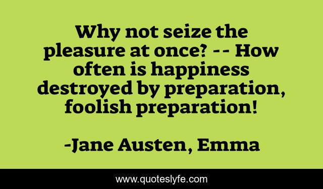 This page presents the quote "Why not seize the pleasure at once? -- How often is happiness destroyed by preparation, foolish preparation!". Author of this quote is Jane Austen, Emma. This quote is about preparation, pleasures, spontaneity, happiness,.