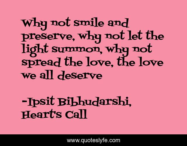 This page presents the quote "Why not smile and preserve, why not let the light summon, why not spread the love, the love we all deserve". Author of this quote is Ipsit Bibhudarshi, Heart's Call. This quote is about life, love, light, affection, positive-thoughts, smile, happiness,.