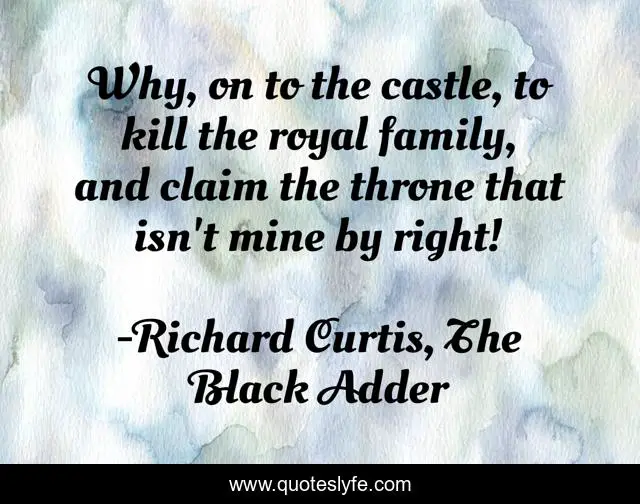 This page presents the quote "Why, on to the castle, to kill the royal family, and claim the throne that isn't mine by right!". Author of this quote is Richard Curtis, The Black Adder. This quote is about humor, slapstick, satire, historical,.