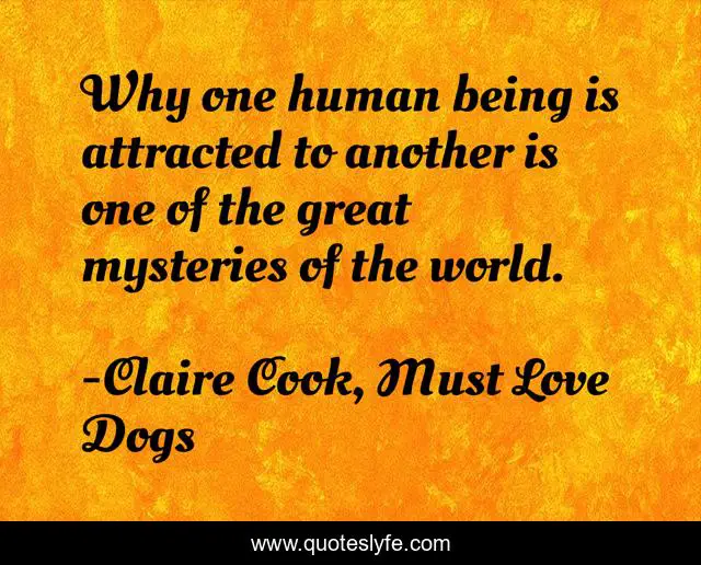This page presents the quote "Why one human being is attracted to another is one of the great mysteries of the world.". Author of this quote is Claire Cook, Must Love Dogs. This quote is about love, dogs-dating, humor-inspirational, dating, personal-ads, affection,.