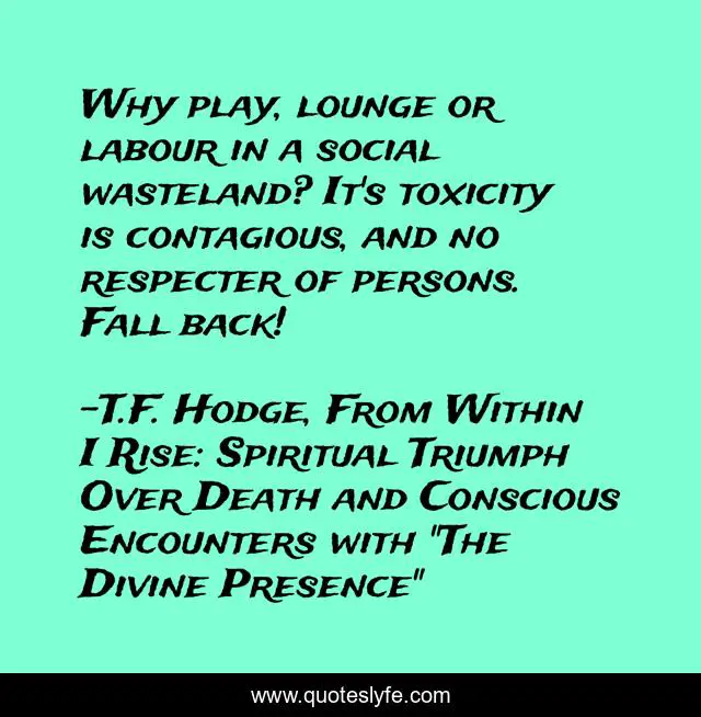 This page presents the quote "Why play, lounge or labour in a social wasteland? It's toxicity is contagious, and no respecter of persons. Fall back!". Author of this quote is T.F. Hodge, From Within I Rise: Spiritual Triumph Over Death and Conscious Encounters with "The Divine Presence". This quote is about energy, influence, negative, socialize, toxic-people, social, toxic,.