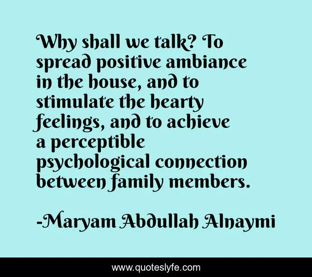 This page presents the quote "Why shall we talk? To spread positive ambiance in the house, and to stimulate the hearty feelings, and to achieve a perceptible psychological connection between family members.". Author of this quote is Maryam Abdullah Alnaymi. This quote is about parenting, upbringing, parenting-advice,.