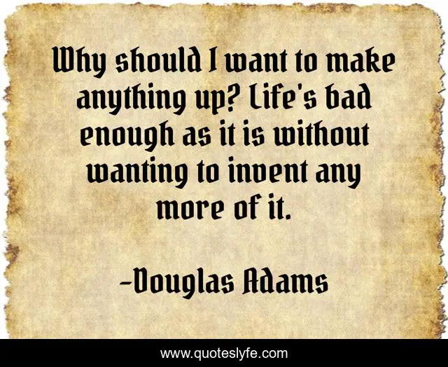 This page presents the quote "Why should I want to make anything up? Life's bad enough as it is without wanting to invent any more of it.". Author of this quote is Douglas Adams. This quote is about marvin, life, 248, on-fiction, fiction,.