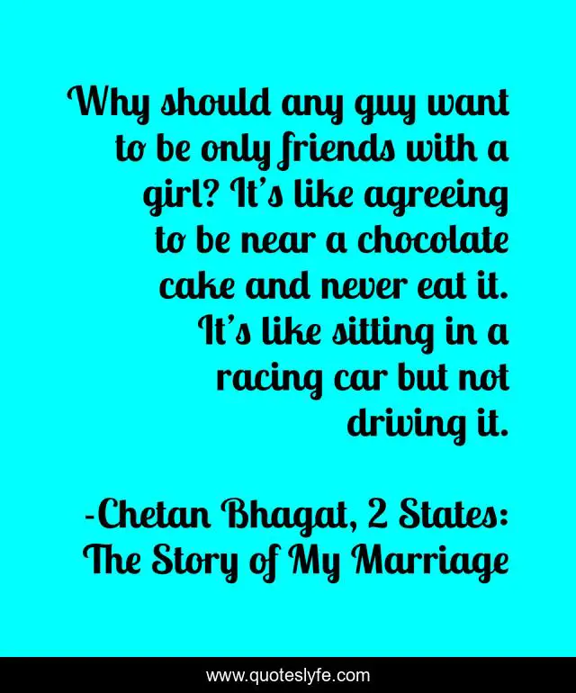 This page presents the quote "Why should any guy want to be only friends with a girl? It’s like agreeing to be near a chocolate cake and never eat it. It’s like sitting in a racing car but not driving it.". Author of this quote is Chetan Bhagat, 2 States: The Story of My Marriage. .
