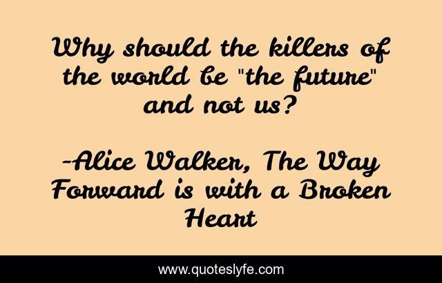 This page presents the quote "Why should the killers of the world be "the future" and not us?". Author of this quote is Alice Walker, The Way Forward is with a Broken Heart. This quote is about future, violence,.