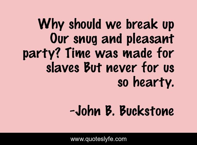 This page presents the quote "Why should we break up Our snug and pleasant party? Time was made for slaves But never for us so hearty.". Author of this quote is John B. Buckstone. .