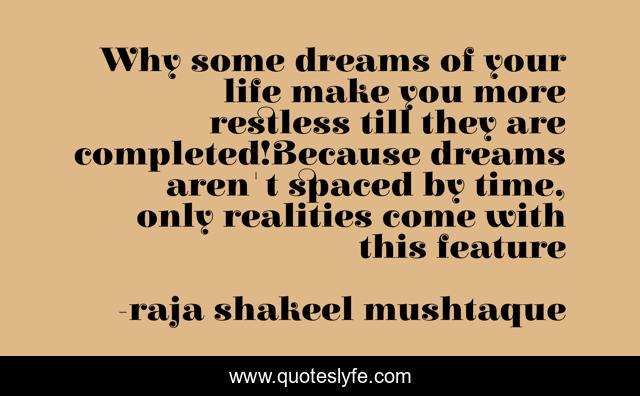 This page presents the quote "Why some dreams of your life make you more restless till they are completed!Because dreams aren't spaced by time, only realities come with this feature". Author of this quote is raja shakeel mushtaque. This quote is about life, reality, inspiration, dreams, positive-thinking,.