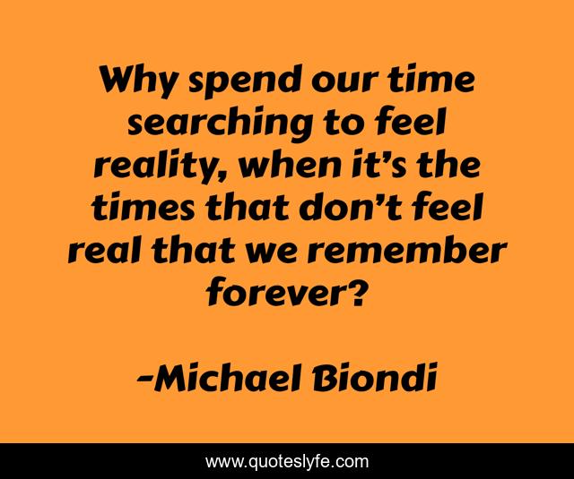 This page presents the quote "Why spend our time searching to feel reality, when it’s the times that don’t feel real that we remember forever?". Author of this quote is Michael Biondi. This quote is about breathe, dreams, poetry, life-lessons, dreamer,.