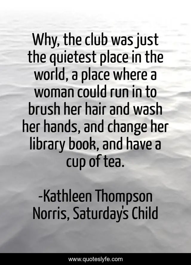 This page presents the quote "Why, the club was just the quietest place in the world, a place where a woman could run in to brush her hair and wash her hands, and change her library book, and have a cup of tea.". Author of this quote is Kathleen Thompson Norris, Saturday's Child. This quote is about quietness, tea, women,.