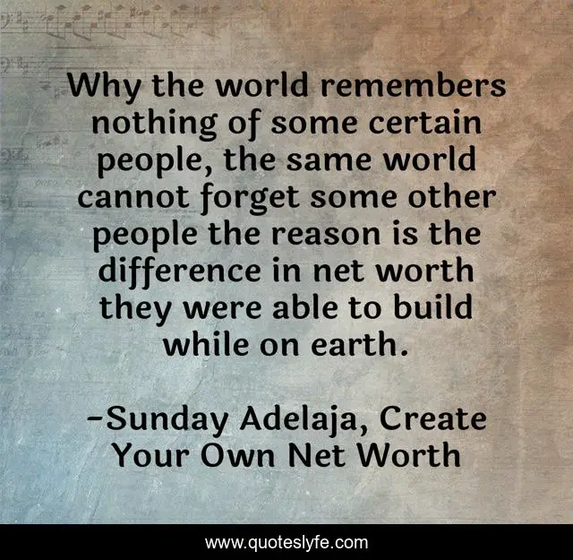 This page presents the quote "Why the world remembers nothing of some certain people, the same world cannot forget some other people the reason is the difference in net worth they were able to build while on earth.". Author of this quote is Sunday Adelaja, Create Your Own Net Worth. This quote is about life, self-image, net-worth, god, people, self-worth, reason, earth, world,.