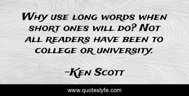 This page presents the quote "Why use long words when short ones will do? Not all readers have been to college or university.". Author of this quote is Ken Scott. This quote is about long-words, simplicity, education, writing,.