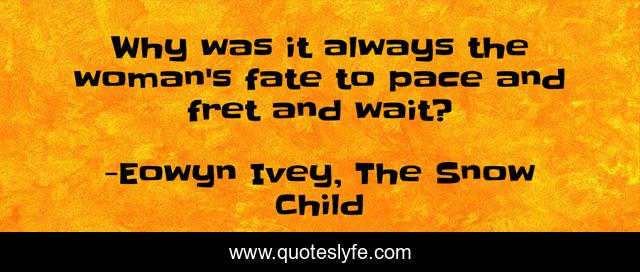 This page presents the quote "Why was it always the woman's fate to pace and fret and wait?". Author of this quote is Eowyn Ivey, The Snow Child. This quote is about woman, feminist,.