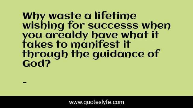 This page presents the quote "Why waste a lifetime wishing for successs when you arealdy have what it takes to manifest it through the guidance of God?". Author of this quote is . This quote is about edmond-mbiaka, guidance-of-god, why-waste-a-lifetime-wishing, wishing-for-success,.