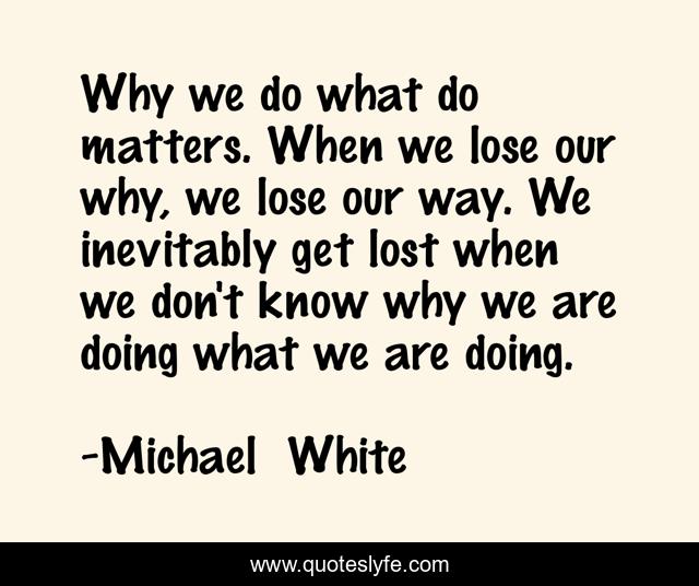 This page presents the quote "Why we do what do matters. When we lose our why, we lose our way. We inevitably get lost when we don't know why we are doing what we are doing.". Author of this quote is Michael White. This quote is about communication, gospel, church,.