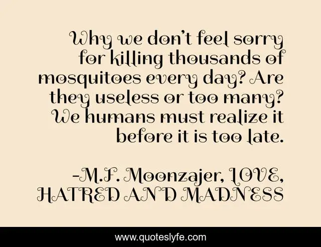 This page presents the quote "Why we don’t feel sorry for killing thousands of mosquitoes every day? Are they useless or too many? We humans must realize it before it is too late.". Author of this quote is M.F. Moonzajer, LOVE, HATRED AND MADNESS. This quote is about feel, humans, mosquitoes, late, useless, sorry, killing, realize,.