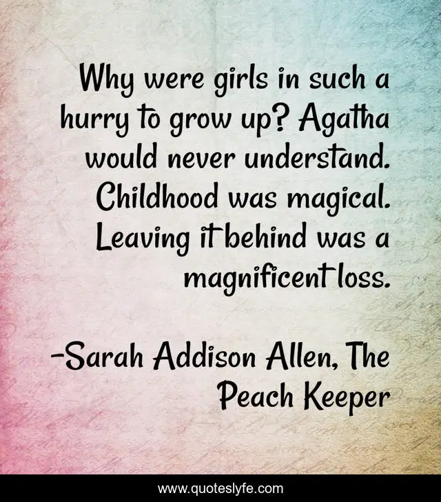 This page presents the quote "Why were girls in such a hurry to grow up? Agatha would never understand. Childhood was magical. Leaving it behind was a magnificent loss.". Author of this quote is Sarah Addison Allen, The Peach Keeper. This quote is about childhood, women,.