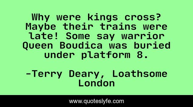 This page presents the quote "Why were kings cross? Maybe their trains were late! Some say warrior Queen Boudica was buried under platform 8.". Author of this quote is Terry Deary, Loathsome London. .