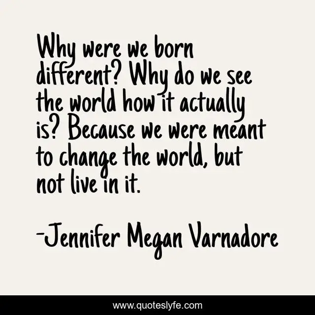 This page presents the quote "Why were we born different? Why do we see the world how it actually is? Because we were meant to change the world, but not live in it.". Author of this quote is Jennifer Megan Varnadore. This quote is about change-the-world, different, life,.