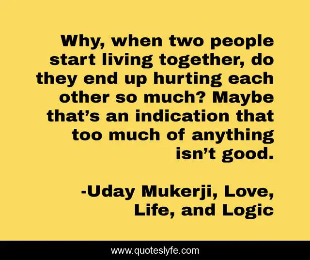 This page presents the quote "Why, when two people start living together, do they end up hurting each other so much? Maybe that’s an indication that too much of anything isn’t good.". Author of this quote is Uday Mukerji, Love, Life, and Logic. This quote is about relationships, uday-mukerji, life-lessons,.