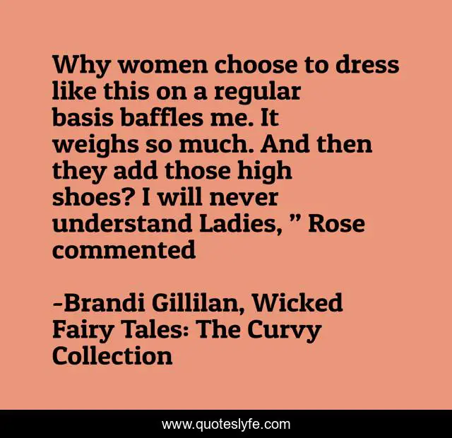 This page presents the quote "Why women choose to dress like this on a regular basis baffles me. It weighs so much. And then they add those high shoes? I will never understand Ladies, ” Rose commented". Author of this quote is Brandi Gillilan, Wicked Fairy Tales: The Curvy Collection. This quote is about romance, erotic-romance, wicked-fairytale,.