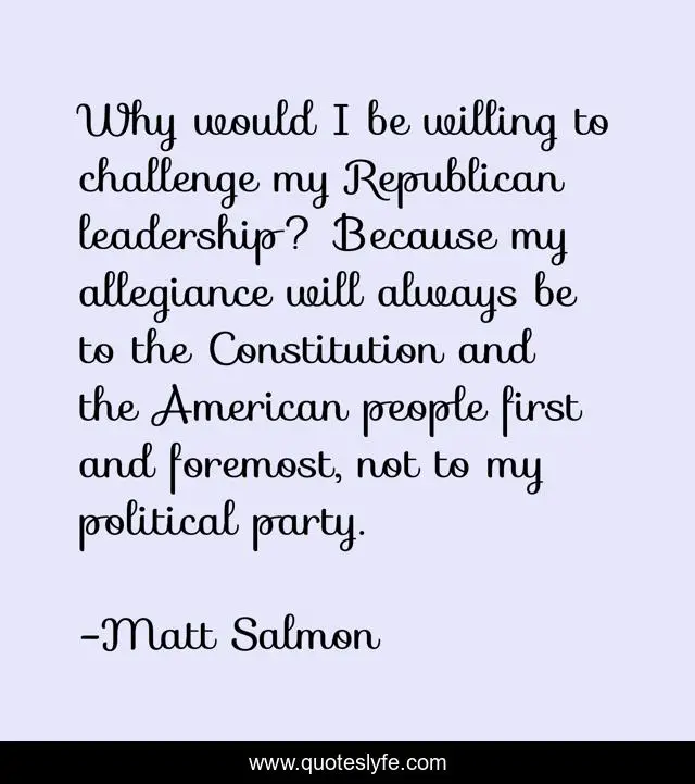 This page presents the quote "Why would I be willing to challenge my Republican leadership? Because my allegiance will always be to the Constitution and the American people first and foremost, not to my political party.". Author of this quote is Matt Salmon. This quote is about challenge, american,.