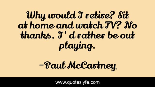 This page presents the quote "Why would I retire? Sit at home and watch TV? No thanks. I'd rather be out playing.". Author of this quote is Paul McCartney. This quote is about retire, thanks, why,.