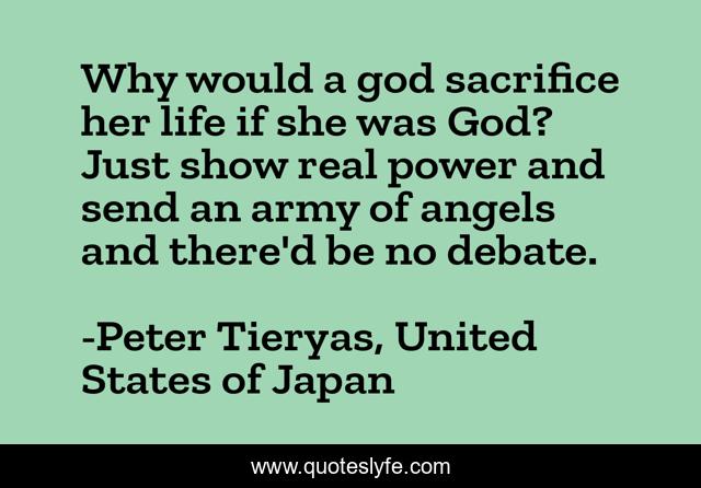 This page presents the quote "Why would a god sacrifice her life if she was God? Just show real power and send an army of angels and there'd be no debate.". Author of this quote is Peter Tieryas, United States of Japan. This quote is about religion, sacrifice, power,.