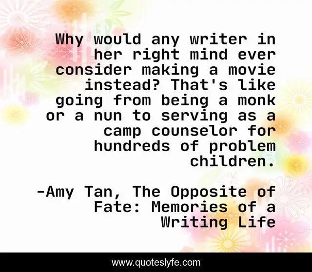 This page presents the quote "Why would any writer in her right mind ever consider making a movie instead? That's like going from being a monk or a nun to serving as a camp counselor for hundreds of problem children.". Author of this quote is Amy Tan, The Opposite of Fate: Memories of a Writing Life. This quote is about autobiography, comedy, funny,.
