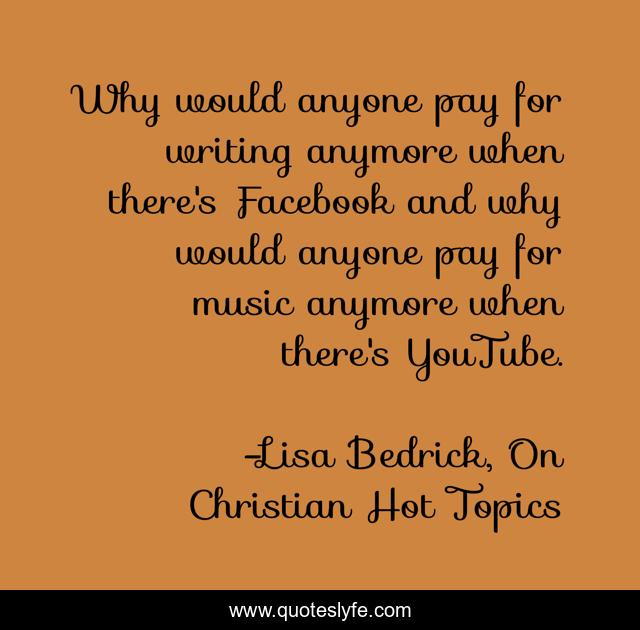 This page presents the quote "Why would anyone pay for writing anymore when there's Facebook and why would anyone pay for music anymore when there's YouTube.". Author of this quote is Lisa Bedrick, On Christian Hot Topics. This quote is about facebook, writers, music, youtube,.