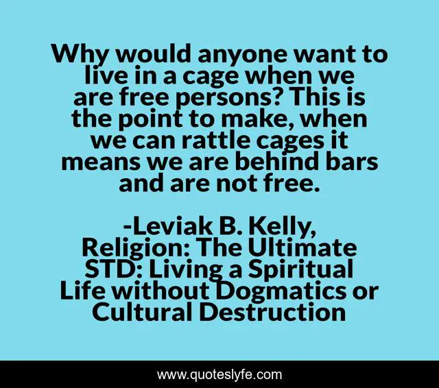 This page presents the quote "Why would anyone want to live in a cage when we are free persons? This is the point to make, when we can rattle cages it means we are behind bars and are not free.". Author of this quote is Leviak B. Kelly, Religion: The Ultimate STD: Living a Spiritual Life without Dogmatics or Cultural Destruction. This quote is about freedom, cage,.