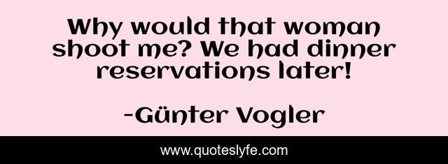 This page presents the quote "Why would that woman shoot me? We had dinner reservations later!". Author of this quote is Günter Vogler. This quote is about bullet-in-the-face, woman, bullet,.