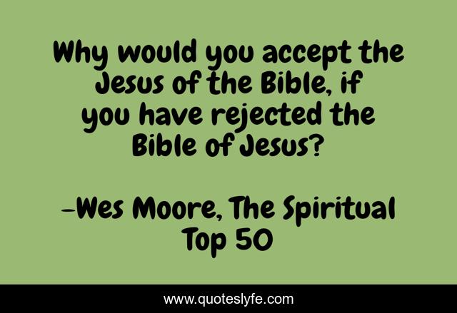 This page presents the quote "Why would you accept the Jesus of the Bible, if you have rejected the Bible of Jesus?". Author of this quote is Wes Moore, The Spiritual Top 50. This quote is about religion, christianity,.