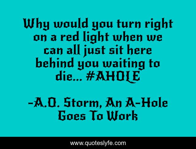 This page presents the quote "Why would you turn right on a red light when we can all just sit here behind you waiting to die... #AHOLE". Author of this quote is A.O. Storm, An A-Hole Goes To Work. This quote is about etiquette, driving, office, work, ahole, commute,.
