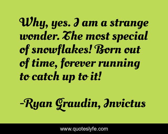 This page presents the quote "Why, yes. I am a strange wonder. The most special of snowflakes! Born out of time, forever running to catch up to it!". Author of this quote is Ryan Graudin, Invictus. This quote is about time-travel, humor, special-snowflake,.