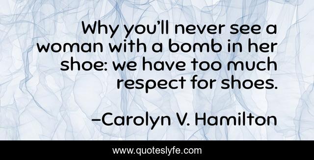 This page presents the quote "Why you’ll never see a woman with a bomb in her shoe: we have too much respect for shoes.". Author of this quote is Carolyn V. Hamilton. This quote is about woman, humor, shoes, terrorists, travel, bombs,.
