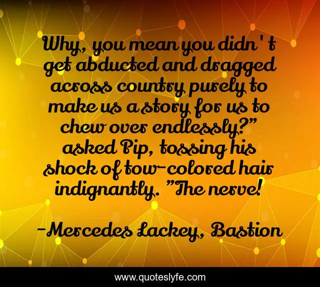 This page presents the quote "Why, you mean you didn't get abducted and dragged across country purely to make us a story for us to chew over endlessly?" asked Pip, tossing his shock of tow-colored hair indignantly. "The nerve!". Author of this quote is Mercedes Lackey, Bastion. This quote is about friends, humor, sarcasm,.