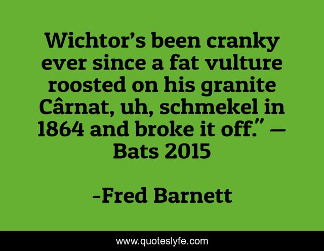This page presents the quote "Wichtor’s been cranky ever since a fat vulture roosted on his granite Cârnat, uh, schmekel in 1864 and broke it off." — Bats 2015". Author of this quote is Fred Barnett. This quote is about bats, vampires,.
