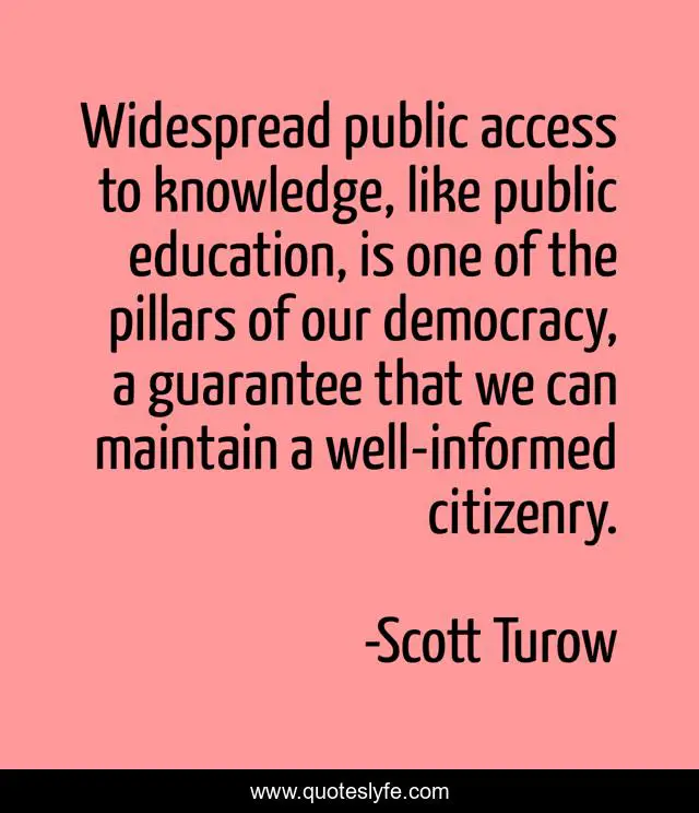 This page presents the quote "Widespread public access to knowledge, like public education, is one of the pillars of our democracy, a guarantee that we can maintain a well-informed citizenry.". Author of this quote is Scott Turow. This quote is about education, democracy,.